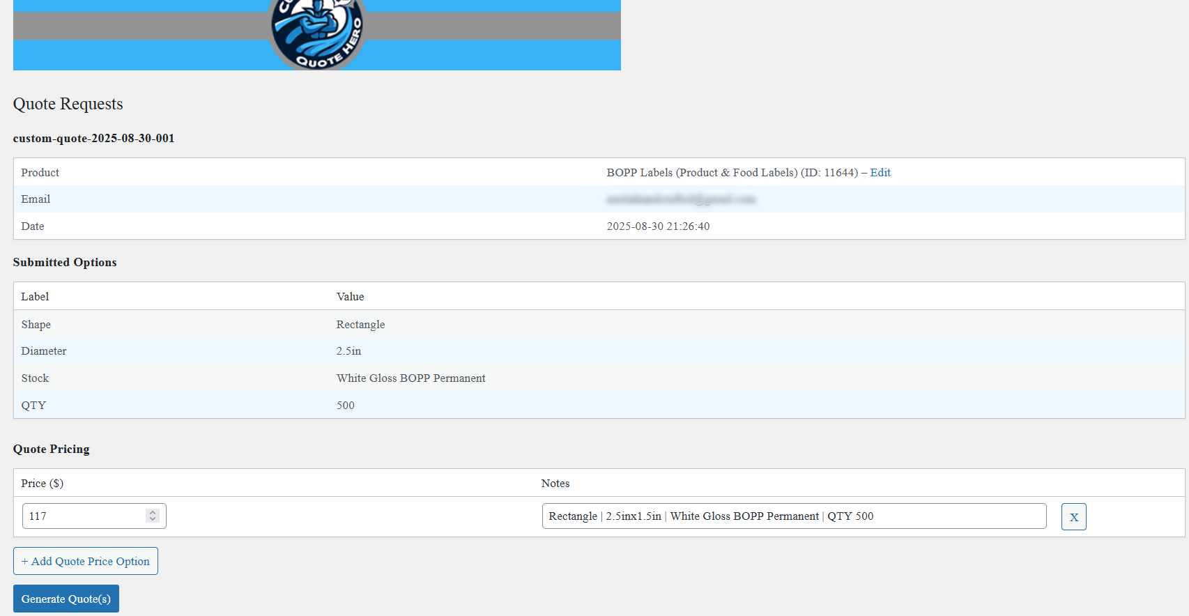 - Click Generate Quote(s) to create purchasable WooCommerce products