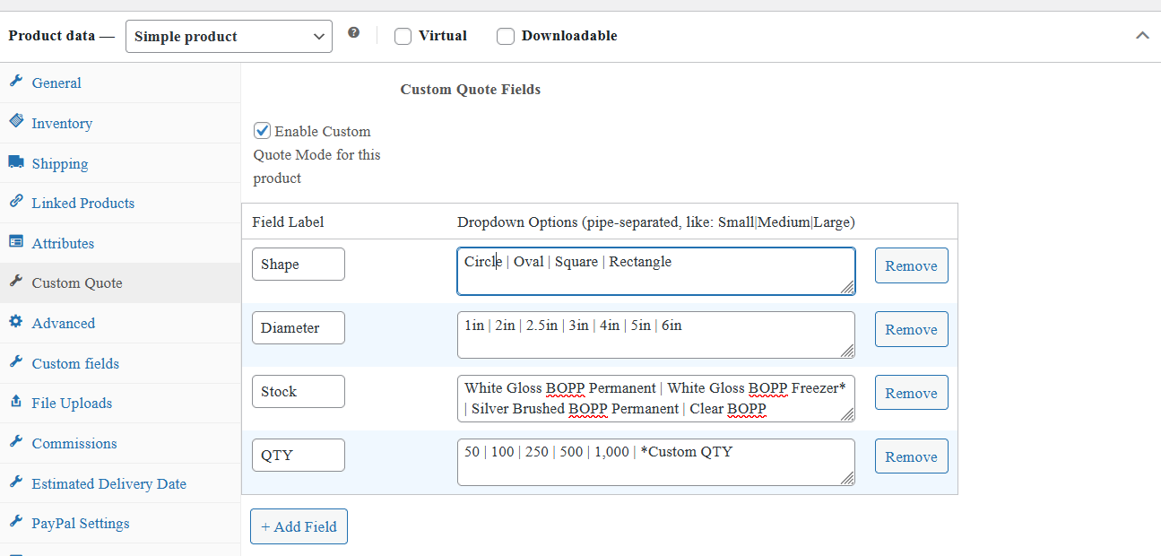 Inside the Custom Quote tab, you can add any custom fields such as: