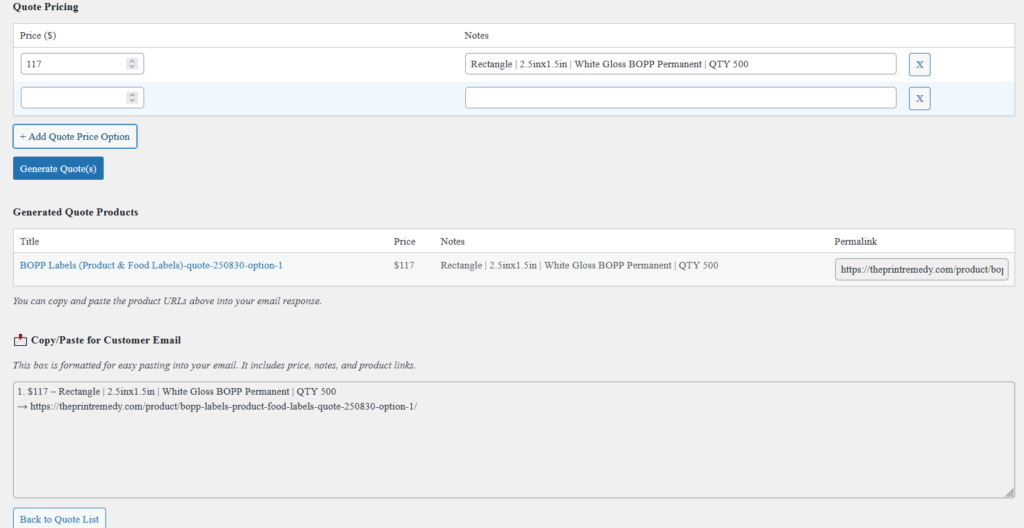 After generating quote products, Custom Quote Hero provides a formatted copy/paste email box that includes price, notes, and direct product links.